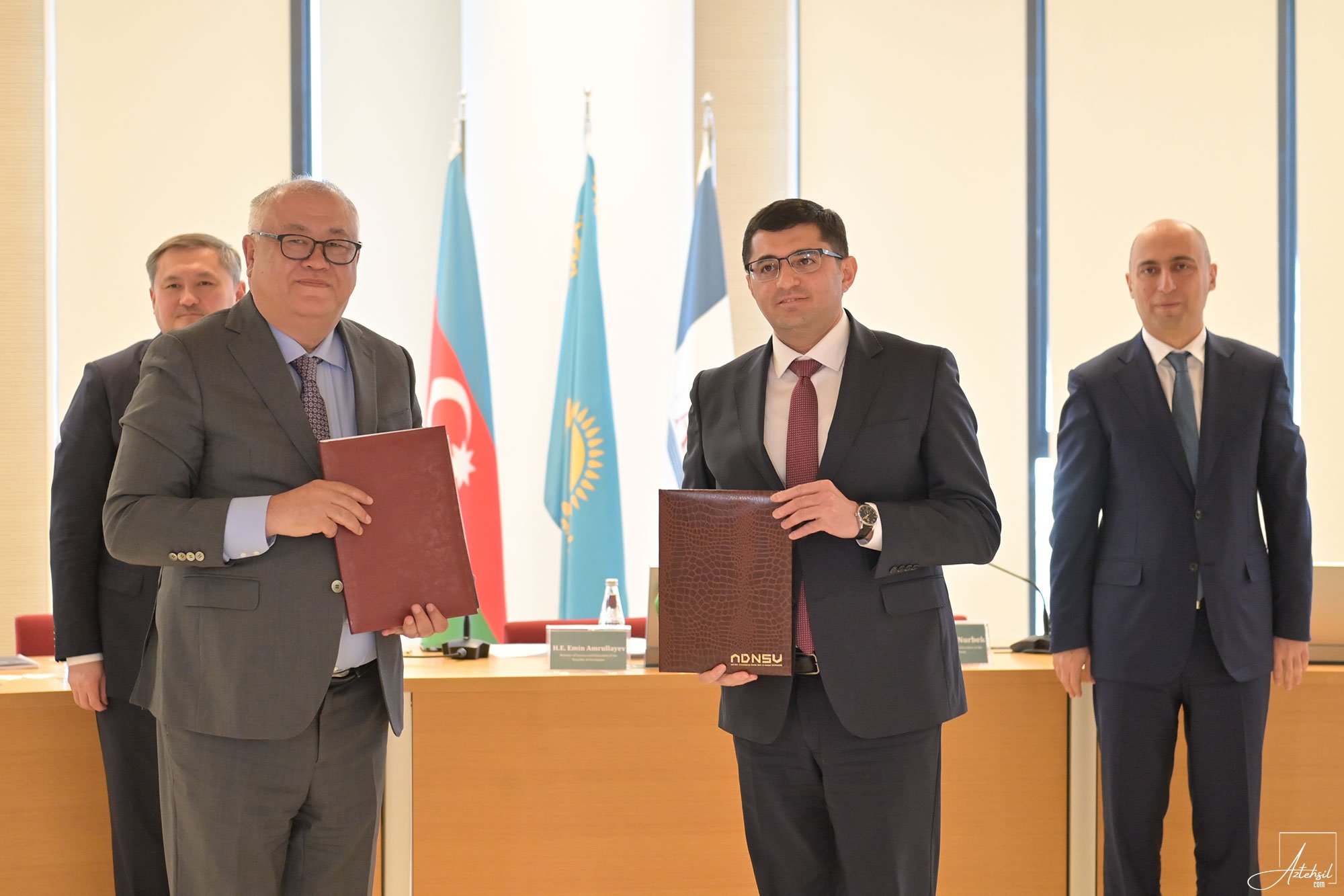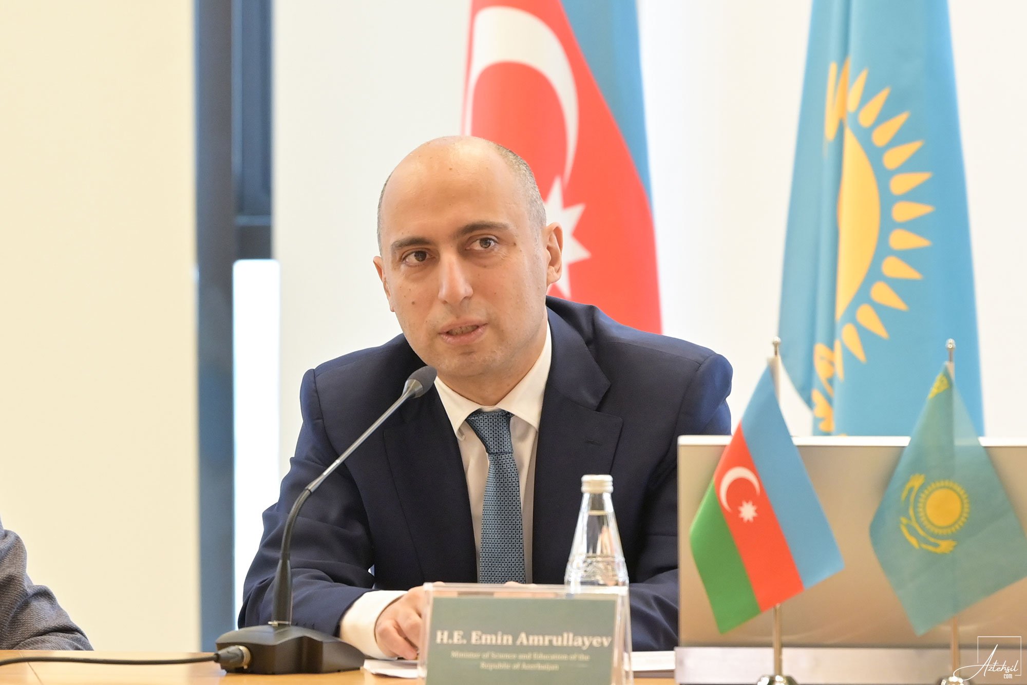 Elm və təhsil naziri Emin Əmrullayev də öz növbəsində Azərbaycanla Qazaxıstan arasında təhsil sahəsində əməkdaşlığın inkişaf etdirilməsinin vacibliyinə toxunub. Emin Əmrullayev qeyd edib ki, hər iki ölkənin öz milli maraqları mövcuddur və bu maraqlara əsaslanaraq təhsil sahəsində oxşar hərəkət modelindən istifadəyə qərar verilib. Nazir vurğulayıb ki, əsas məqsəd ali təhsili gücləndirmək və universitetlərimizin davamlı inkişafını təmin etməkdir. Bakıda ilk dəfə keçiriləcək Qazaxıstan universitetlərinin təhsil sərgisindən söz açan Emin Əmrullayev qeyd edib ki, bu tədbir akademik əməkdaşlıq üçün mühüm bir addımdır. Nazir hər iki ölkənin universitetlərini qarşılıqlı sıx əməkdaşlığa çağırıb.