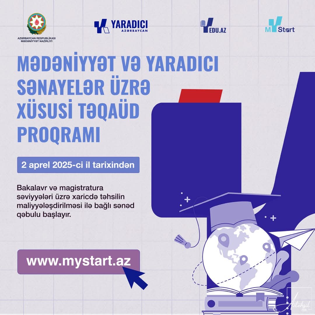 Azərbaycan Respublikası Mədəniyyət Nazirliyinin “Mədəniyyət və yaradıcı sənayelər üzrə xüsusi Təqaüd Proqramı” çərçivəsində bakalavr və magistratura səviyyələri üzrə xaricdə təhsilin maliyyələşdirilməsi ilə bağlı 2 aprel 2025-ci il tarixindən etibarən sənəd qəbuluna başlanılacaqdır.