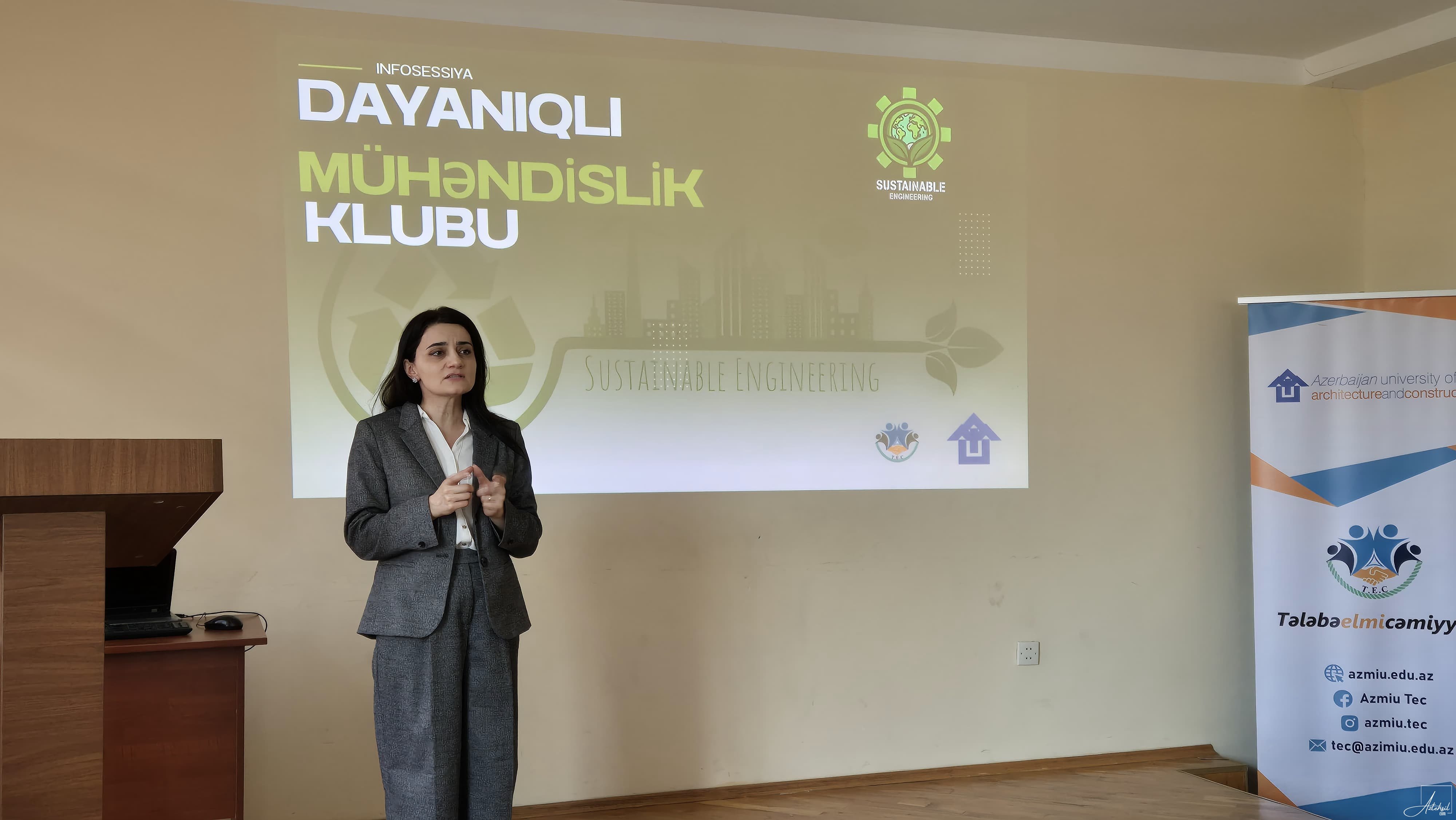 Tədbirin davamında klubun sədri Məleykə Əliyeva və digər komanda üzvləri “Dayanıqlı Mühəndislik” adlı təqdimatla çıxış ediblər. Təqdimat zamanı alternativ enerji mənbələrinin mühəndislik sahəsində rolu, klubun strateji hədəfləri, planlaşdırılan seminarlar, texniki ekskursiyalar və layihələr barədə ətraflı məlumat verilib. Həmçinin klub üzvləri auditoriyaya təqdim olunub, onların gələcək fəaliyyət istiqamətləri haqqında məlumat verilib.