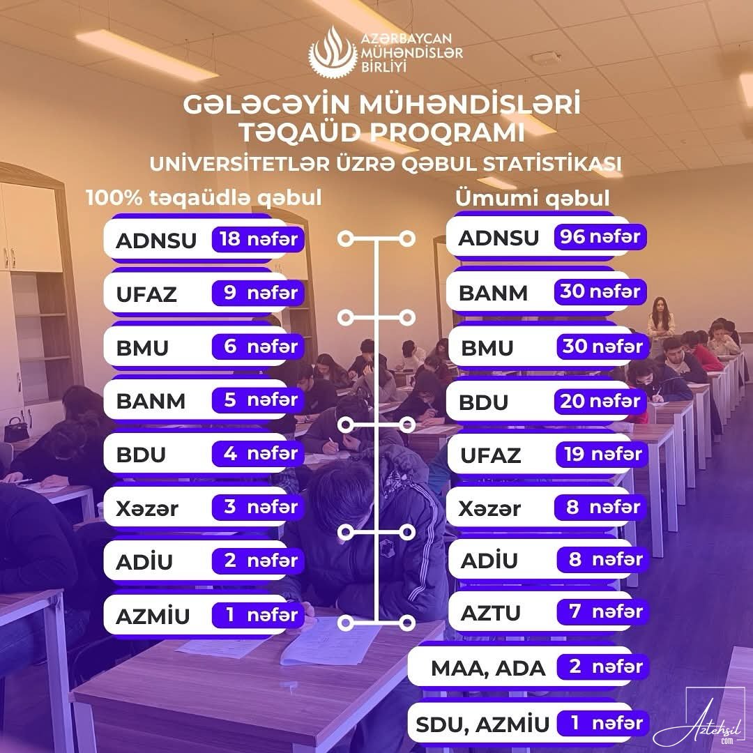 Tələbələr qəbul imtahanında iştirak edərək 100%, 90%, 70% və 50% təqaüd əldə ediblər. Bundan əlavə, Azərbaycan Mühəndislər Birliyində aktiv fəaliyyət göstərən könüllülər də 100% təqaüdlə proqramda iştirak edəcəklər.