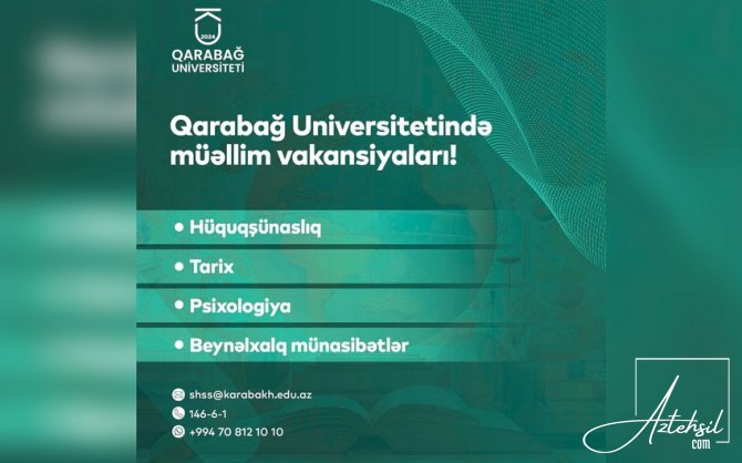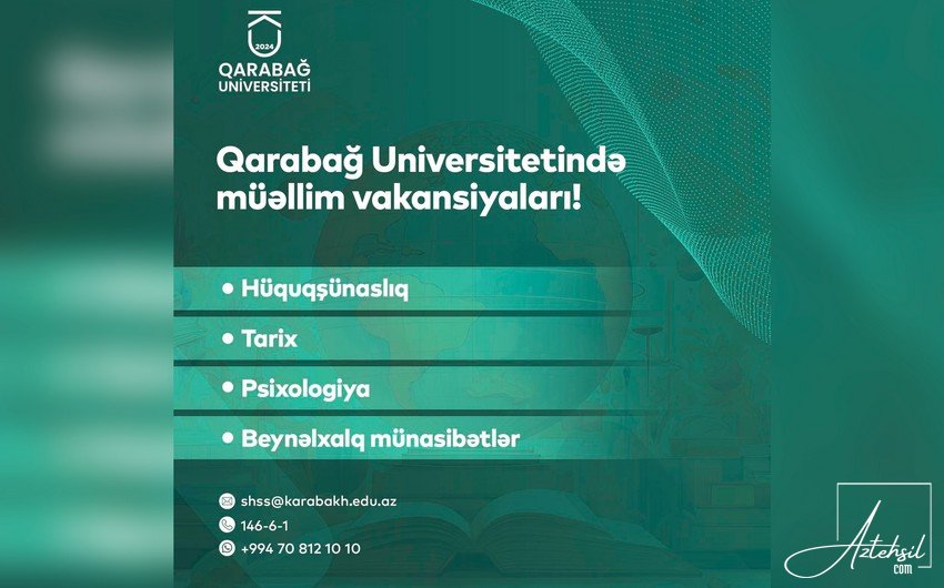 Qarabağ Universiteti “Hüquqşünaslıq”, “Psixologiya”, “Tarix” və “Beynəlxalq münasibətlər” ixtisasları üzrə müəllim vakansiyaları elan edir.