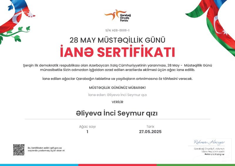 Abşeron rayon Mehdi Hüseynzadə adına Novxanı kənd 1 nömrəli tam orta məktəbin şagirdləri – 1-ci sinif şagirdi İnci Əliyeva və 5-ci sinif şagirdi Fateh Əliyev ad günləri və Müstəqillik Günü ilə bağlı maraqlı və bir o qədər də nəcib addım atıblar. Belə ki, şagirdlər ad günlərini 28 may – Müstəqillik Günü münasibətilə Qarabağ Dirçəliş Fonduna ağac ianə etməklə qeyd ediblər.