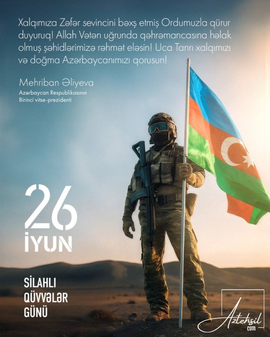AzTehsil.com xəbər verir ki, Azərbaycan Respublikasının Birinci vitse-prezidenti Mehriban Əliyeva instaqram hesabında 26 İyun - Silahlı Qüvvələr Günü münasibətilə paylaşım edib.![]()