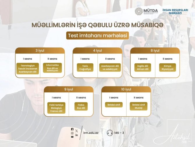 AzTehsil.com xəbər verir ki, 2025-2026-cı dərs ili üçün müəllimlərin işə qəbulu üzrə müsabiqənin test imtahanları ilə bağlı məlumat şəxsi səhifələrinə göndərilib. Namizədlər şəxsi səhifələrinə daxil olaraq imtahanların alınması üçün tarix və məkanla tanış ola bilərsiniz.