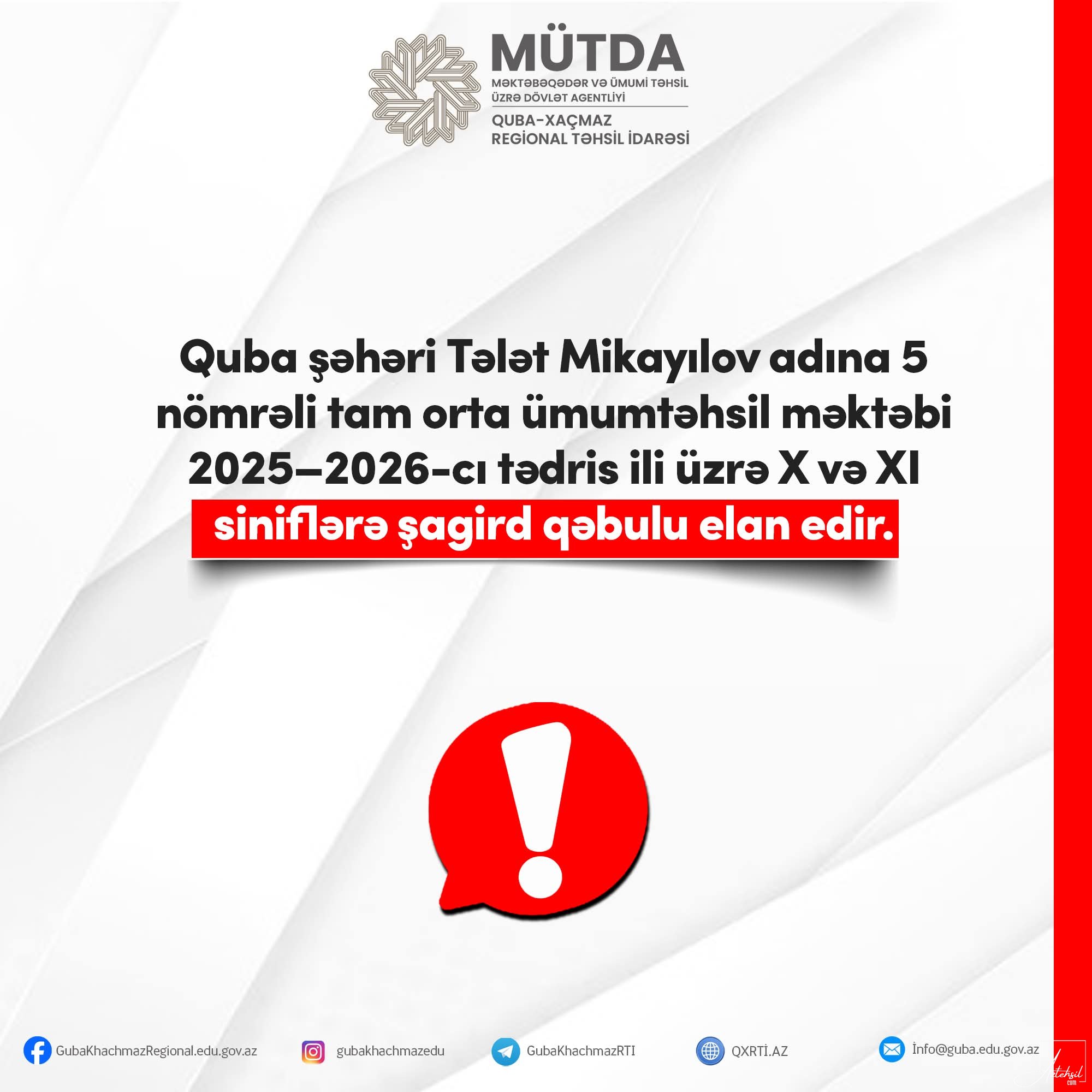 AzTehsil.com xəbər verir ki, Quba-Xaçmaz Regional Təhsil İdarəsinin tabeliyində fəaliyyət göstərən Quba şəhəri Tələt Mikayılov adına 5 nömrəli tam orta ümumtəhsil məktəbi 2025–2026-cı tədris ili üzrə X və XI siniflərə şagird qəbulu elan edir.