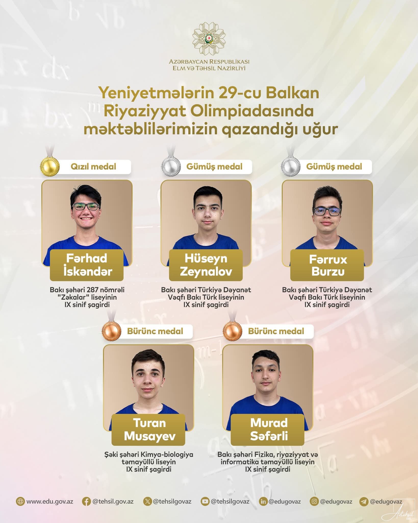 AzTehsil.com- n əldə etdiyi məlumata görə Məktəblilərimiz bu olimpiadadan 1 qızıl, 2 gümüş və 2 bürünc olmaqla 5 medal qazanıblar.