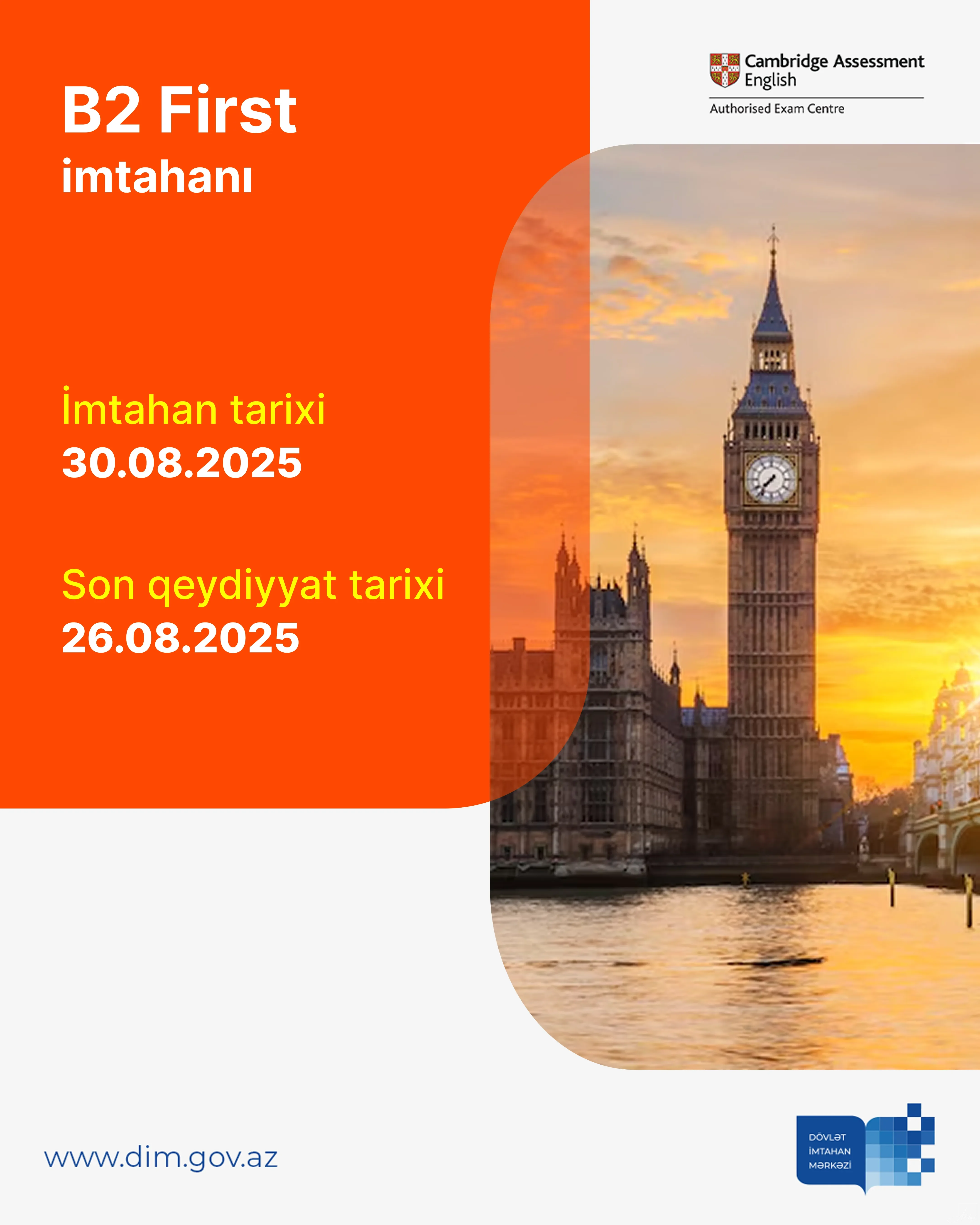 İmtahan 30 avqust 2025-ci il tarixində DİM-in Binəqədi rayonu, Süleyman Sani Axundov küçəsi, 50 ünvanında yerləşən binasında təşkil olunacaq.
