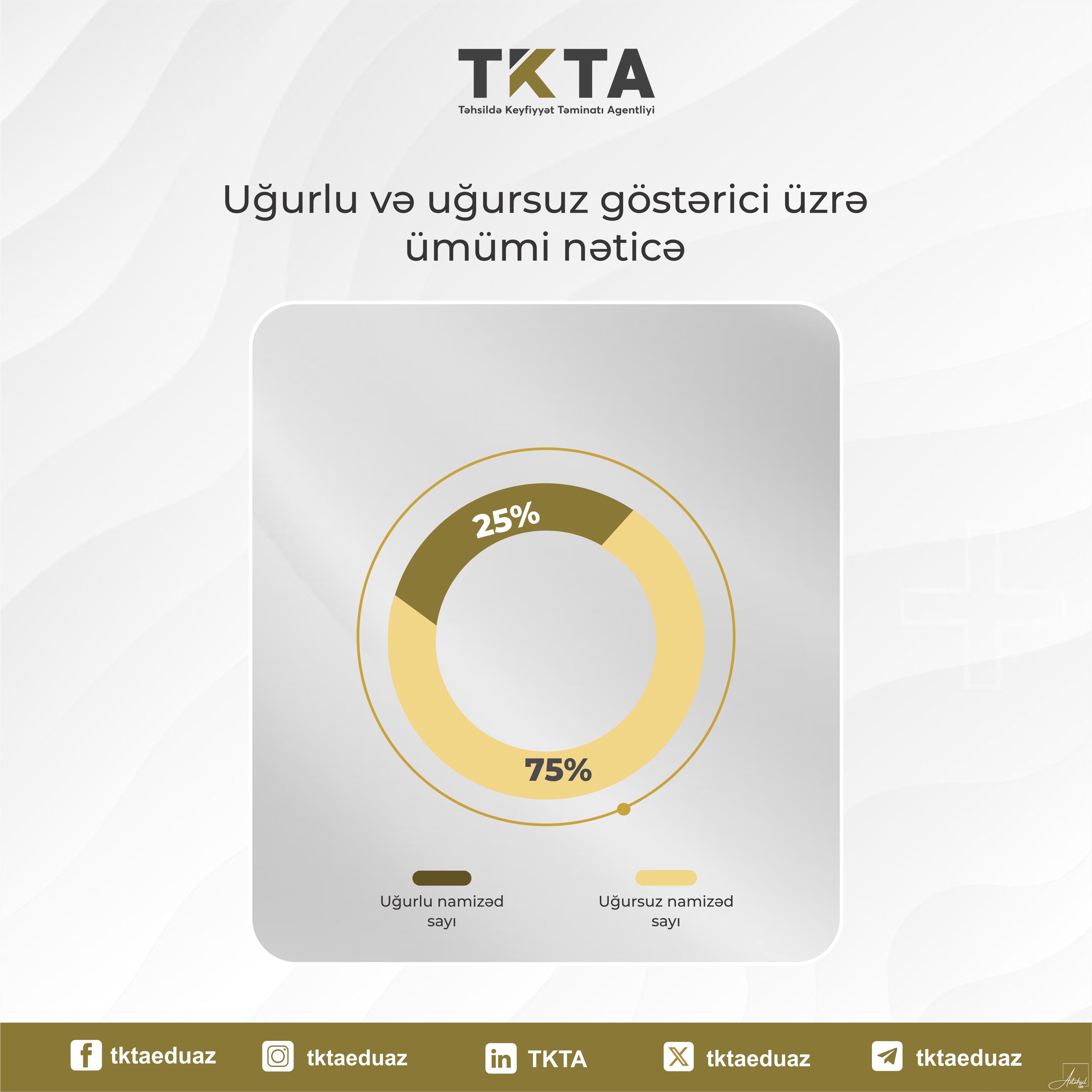 Müəllimlik, mühəndislik və hüquq ixtisasları üzrə xaricdə əldə edilmiş kvalifikasiyaların peşə tanınması ilə bağlı keçirilmiş imtahanın nəticəsinə dair məlumat...“Xarici dövlətlərin ali təhsilə aid kvalifikasiyalarının tanınması Qaydaları”nın 6.2-ci bəndinə əsasən müəllimlik, mühəndislik və hüquq ixtisasları üzrə ərizəçinin Elm və Təhsil Nazirliyinin tabeliyində fəaliyyət göstərən Təhsildə Keyfiyyət Təminatı Agentliyinin (TKTA) sifarişi ilə Dövlət İmtahan Mərkəzinin (DİM) təşkil etdiyi imtahanda müvəffəqiyyət qazanması (keçid balını toplaması) tələb olunur. Bildiririk ki, 23 iyun 2025-ci il tarixində DİM tərəfindən keçirilmiş imtahanda iştirak etmək üçün 295 nəfər namizəd qeydiyyatdan keçmiş, bunlardan 240 nəfəri imtahanda iştirak etmişdir. 25 ixtisas üzrə müvəffəqiyyət göstəricisi 25% təşkil etmişdir. İxtisaslar üzrə iştirak etmiş və keçid balını toplamış namizədlərlə bağlı statistikanı təqdim edirik.Bildirikik ki, imtahanda ixtisaslar üzrə müraciət sayına uyğun olaraq ən çox imtina almış 4 ixtisasın ölkələr üzrə təhlili aparılmışdır.Peşə tanınması imtahanında “İbtidai sinif müəllimliyi” ixtisası üzrə 10 nəfər iştirak etmiş, onlardan yalnız 1 nəfəri uğurlu nəticə əldə etmişdir. Ölkələr üzrə Rusiya Federasiyasından 2 (Həştərxan Dövlət Universiteti, Moskva Dövlət Vilayət Universiteti), Türkiyə Respublikasından 2 (Bursa Uludağ Universiteti, Sivas Cumhuriyyət Universiteti), Gürcüstandan 2 (“İveriya” Tbilisi Müstəqil Universiteti, İ. Çavaxişvili adına Tblisi Dövlət Universiteti), Ukraynadan 1 (Q.S.Skovoroda adına Xarkov Milli Pedaqoji Universiteti), Belarus Respublikasından 1 (İ.P.Şamyakin adına Mozır Dövlət Pedaqoji Universiteti), Qazaxıstan Respublikasından 1 (Pavlodar Dövlət Pedaqoji İnstitutu) nəfərin uğursuz nəticəsi qeydə alınmışdır. Ölkələr üzrə Rusiya Federasiyasından (Smolensk Dövlət Universiteti) 1 nəfər 30 maksimum baldan 15 keçid balını toplayaraq uğurlu nəticə əldə etmişdir. Beləliklə, “İbtidai sinif müəllimliyi” ixtisası üzrə peşə tanınması əldə etmək istəyən namizdələrin 90% müvafiq imtahanda uğursuz olmuşdur.Peşə tanınması imtahanında “Həyat fəaliyyətinin təhlükəsizliyi mühəndisliyi” ixtisası üzrə 23 nəfər iştirak etmiş, onlardan yalnız 1 nəfəri uğurlu nəticə əldə etmişdir. Ölkələr üzrə Belarus Respublikasından 21 (Belarus Respublikası Fövqəladə Hallar Nazirliyinin Mülki Müdafiə Universiteti) və Ukraynadan 1 (Milli Texniki Universiteti “Xarkov Politexnik İnstitutu”) nəfərin uğursuz nəticəsi qeydə alınmışdır. Ölkələr üzrə Belarus Respublikasından 1 (Belarus Respublikası Fövqəladə Hallar Nazirliyinin Mülki Müdafiə Universiteti) nəfər 30 maksimum baldan 15 keçid balını toplayaraq uğurlu nəticə əldə etmişdir. Beləliklə, “Həyat fəaliyyətinin təhlükəsizliyi mühəndisliyi” ixtisası üzrə peşə tanınması əldə etmək istəyən namizdələrin 96% müvafiq imtahanda uğursuz olmuşdur.