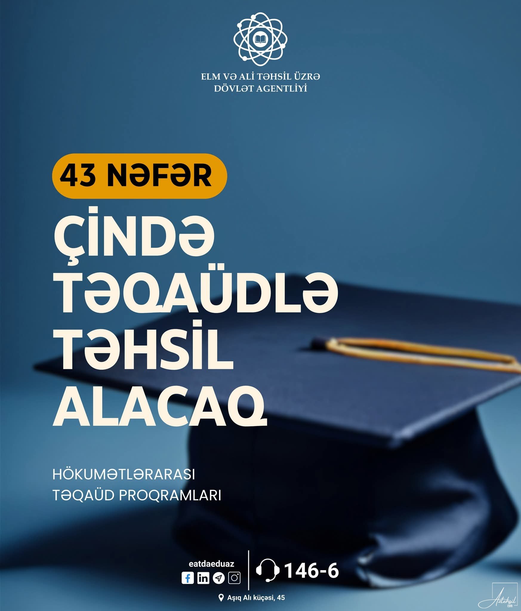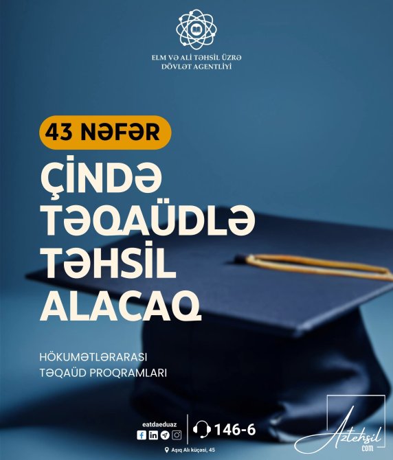 Azərbaycan Respublikasının Təhsil Nazirliyi ilə Çin Xalq Respublikasının Təhsil Nazirliyi arasında təhsil sahəsində əməkdaşlıq haqqında sazişə əsasən, 2025-2026-cı tədris ili üzrə Çinin nüfuzlu universitetlərində təhsil almaq hüququ qazanmış 43 nəfər Azərbaycan vətəndaşı müəyyən edilib.