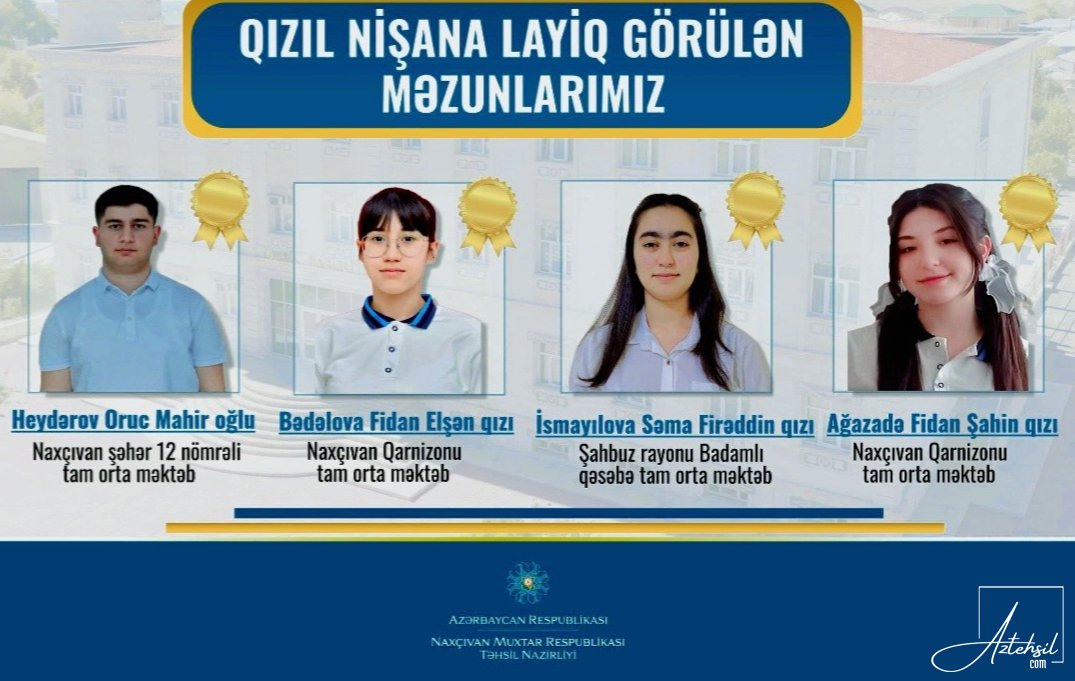Əmrə uyğun olaraq Naxçıvan şəhər 12 nömrəli tam orta məktəbin məzunu Oruc Heydərov, Şahbuz Rayon Badamlı qəsəbə tam orta məktəbinin məzunu Səma İsmayılova, Naxçıvan Qarnizonu tam orta məktəbinin məzunları Fidan Ağazadə və Fidan Bədəlova qızıl nişana layiq görülüblər.![]()