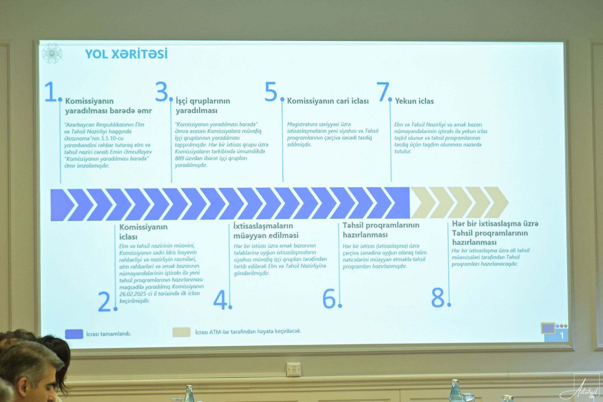 Qeyd edilib ki, iclasın gündəliyindəki əsas məsələlərdən biri işçi qruplar tərəfindən təqdim olunmuş və ekspertizadan keçmiş təhsil proqramlarının mərhələli şəkildə təsdiqidir. İclasda, həmçinin ali təhsil müəssisələri üçün ixtisaslar üzrə yeni təhsil proqramları əsasında ixtisaslaşmaya dair nümunəvi təhsil proqramı və tədris planlarının hazırlanması müzakirə olunub.