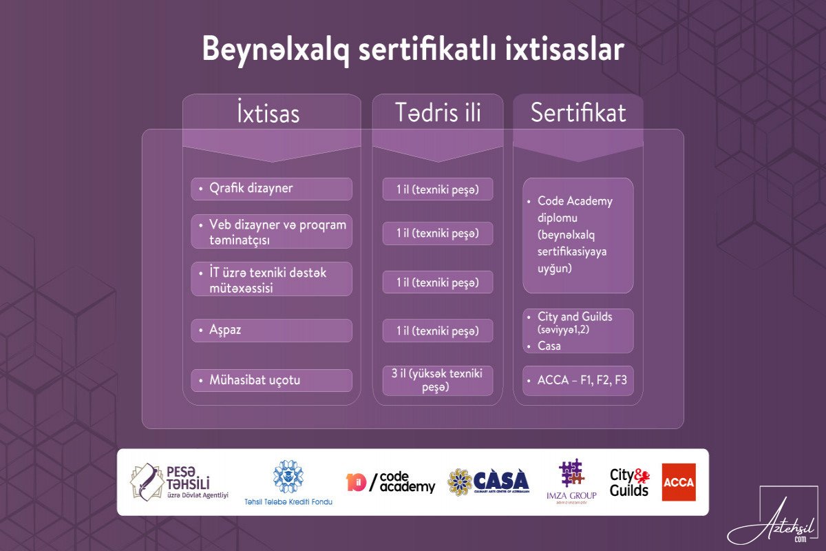 Hazırda qrafik dizayner, veb dizayner və proqram təminatçısı, informasiya texnologiyaları üzrə texniki dəstək mütəxəssisi, aşpaz, beynəlxalq mühasibat uçotu ixtisasları üzrə tələbə qəbulu davam edir. Təqdim olunan proqramlar çərçivəsində tələbələr dövlət nümunəli diplomla yanaşı, beynəlxalq səviyyədə tanınan sertifikatlara sahib olmaq imkanı əldə edəcəklər.