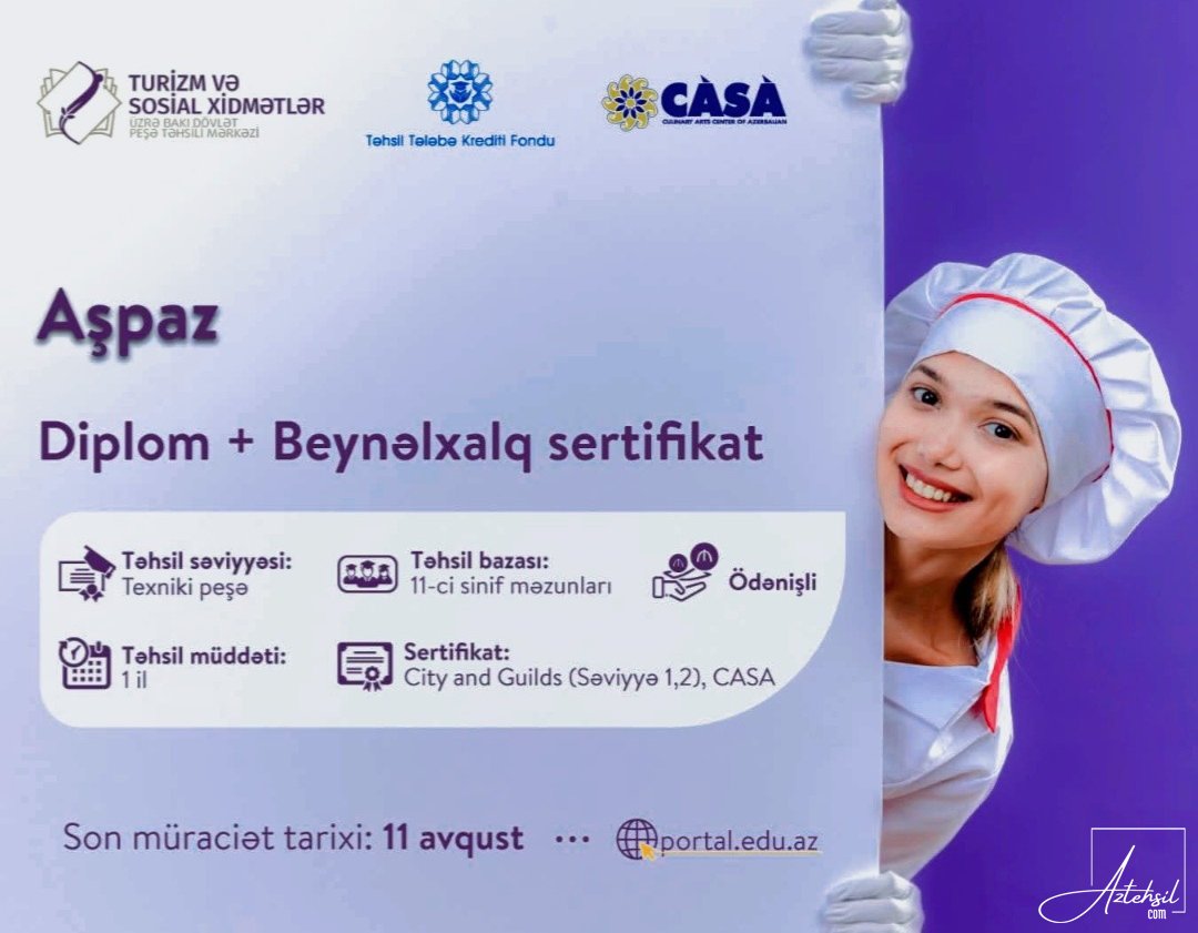 AzTehsil.com xəbər verir ki, 1 ilə həm diplom, həm də "City & Guilds" (Səviyyə 1, səviyyə 2) beynəlxalq sertifikatı al, aşpaz kimi öz yolunu qur!