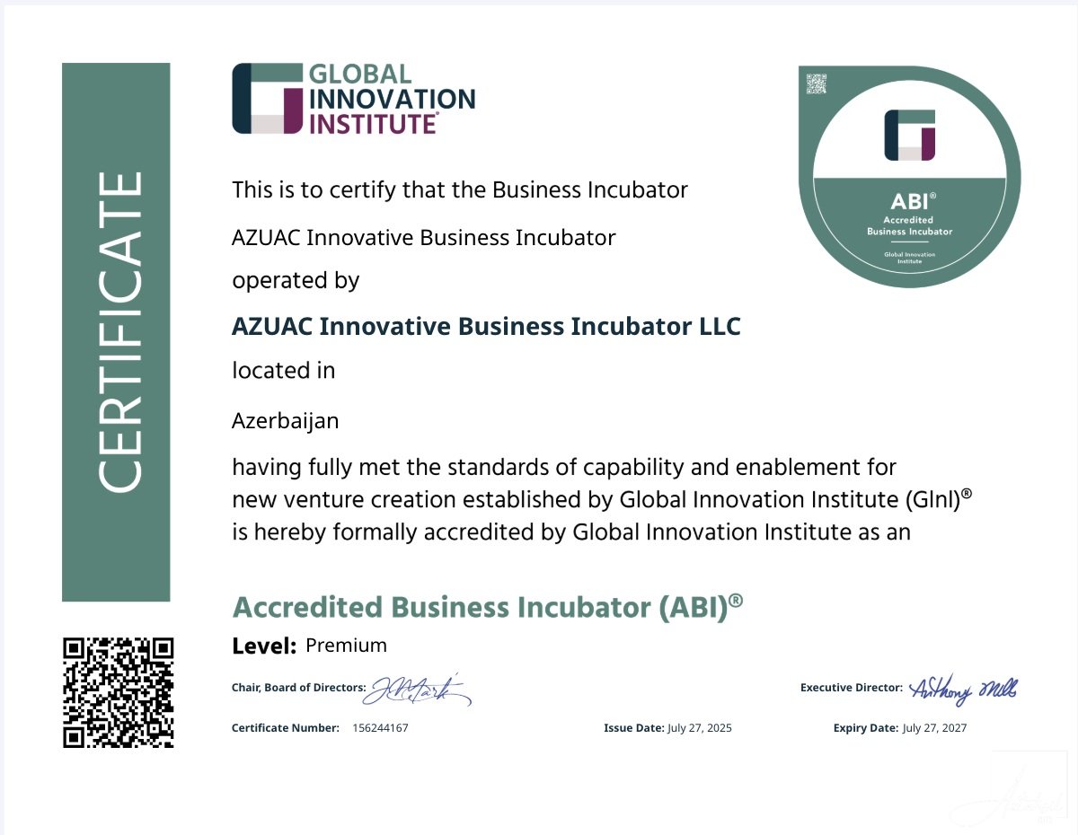 Azərbaycan Memarlıq və İnşaat Universitetinin (AzMİU) nəzdində fəaliyyət göstərən İnnovativ Biznes İnkubator mərkəzi Global Innovation Institute (GINI) tərəfindən Akkreditə Olunmuş Biznes İnkubator (ABI®) statusu alaraq rəsmi beynəlxalq sertifikatla təltif edilib.