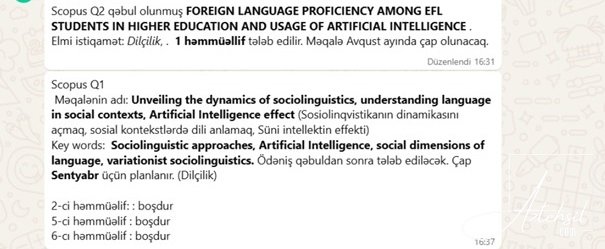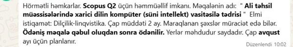 AzTehsil.com xəbər verir ki, Sosial şəbəkələrdə yayılan iddialara görə, bəzi şəxslər tərəfindən “WhatsApp” qrupları yaradılaraq, universitet müəllimlərinə “Scopus” və “WoS” jurnallarında hazır məqalələrə müəlliflik təklif edilib.