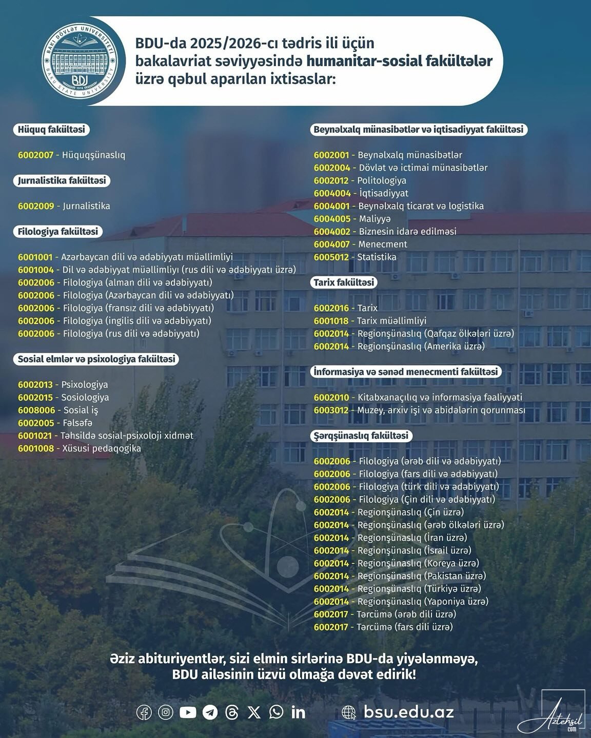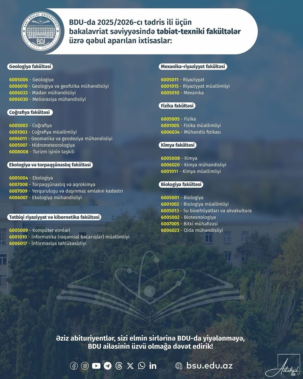 Bakı Dövlət Universiteti (BDU) 2025/2026-cı tədris ili üçün bakalavriat səviyyəsində həm humanitar-sosial, həm də təbiət-texniki istiqamətlər üzrə geniş ixtisas seçimi ilə tələbə qəbulu elan edib.