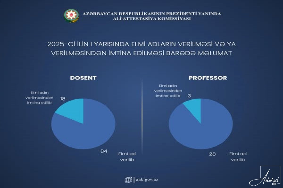 _2025-ci ilin I yarısında 84 nəfərə dosent, 28 nəfərə professor elmi adı verilib. AzTehsil.com xəbər verir ki, bu barədə Ali Attestasiya Komissiyası məlumat yayıb.Belə ki, 18 nəfərə dosent, 3 nəfərə isə professor elmi adının verilməsindən imtina edilib.![]()