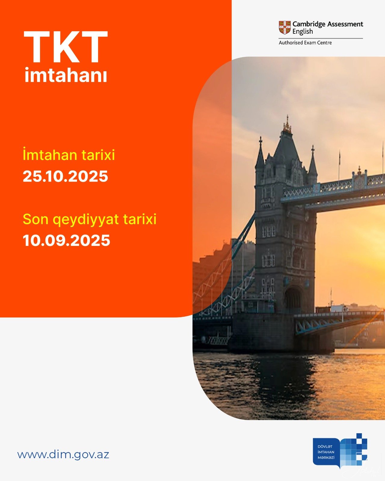 AzTehsil.com xəbər verir ki, imtahan 25 oktyabr 2025-ci il tarixində keçiriləcək. Son qeydiyyat tarixi 10 sentyabrdır.