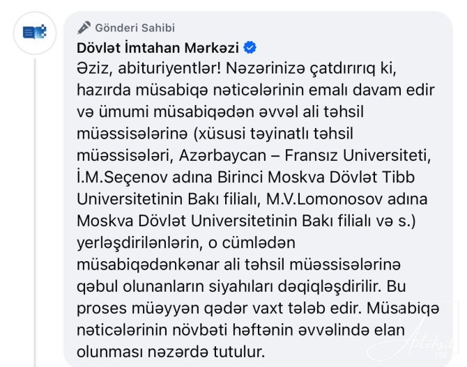 -Əziz, abituriyentlər! Nəzərinizə çatdırırıq ki, hazırda müsabiqə nəticələrinin emalı davam edir və ümumi müsabiqədən əvvəl ali təhsil müəssisələrinə (xüsusi təyinatlı təhsil müəssisələri, Azərbaycan – Fransız Universiteti, İ.M.Seçenov adına Birinci Moskva Dövlət Tibb Universitetinin Bakı filialı, M.V.Lomonosov adına Moskva Dövlət Universitetinin Bakı filialı və s.) yerləşdirilənlərin, o cümlədən müsabiqədənkənar ali təhsil müəssisələrinə qəbul olunanların siyahıları dəqiqləşdirilir. Bu proses müəyyən qədər vaxt tələb edir. AzTehsil.com xəbər verir ki, Müsabiqə nəticələrinin növbəti həftənin əvvəlində elan olunması nəzərdə tutulur.