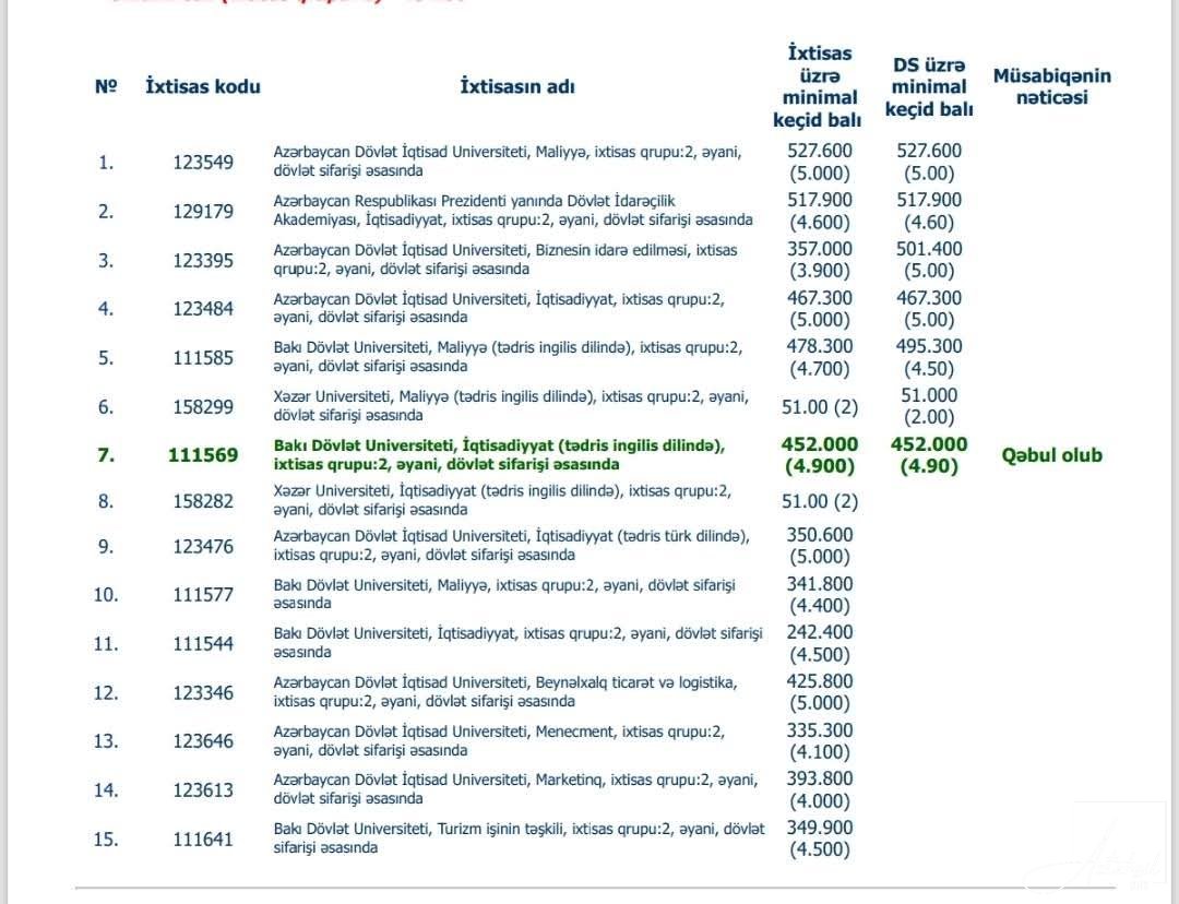 Siz 6-cı yerdə seçdiyiniz ixtisasa dövlət sifarişi əsasında qəbul olmaq istədiyinizi qeyd etmisiniz. Həmin ixtisas üzrə də dövlət sifarişi əsasında olan yerlər digər ali təhsil müəssisələrinin hesabına dolmuşdur. Seçdiyiniz təhsil müəssisəsi üzrə dövlət sifarişi əsasında yer qalmadığına görə həmin ixtisasa yerləşdirmə aparmaq mümkün olmamışdır. Ona görə də bu ixtisasın da qarşısında keçid balı əvəzinə müsabiqə şərti göstərilmişdir. Həmin ixtisas üzrə subbakalavrlar da müsabiqədə iştirak edə bildiyi üçün orada müsabiqədə ən aşağı nəticə ilə iştirak edə biləcək subbakalavrın ÜOMG-si qeyd olunmuşdur.