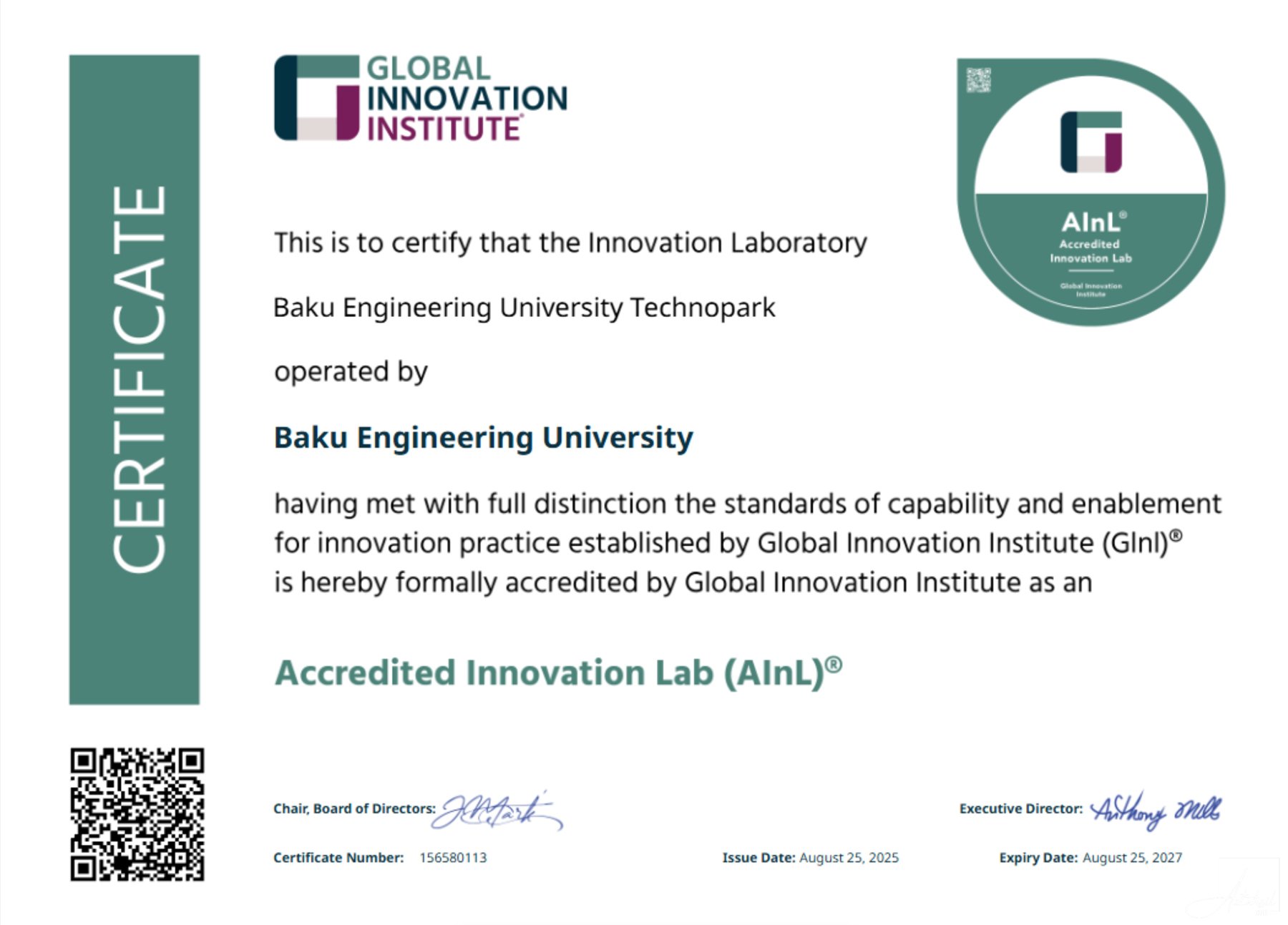 BMU Texnoparkı ölkəmizdə “Innovation Lab” sertifikatını əldə edən ilk qurumdur və bu nüfuzlu sənəd son illər universitetin elmi-tədqiqat və startap ekosisteminin inkişafına verdiyi töhfənin beynəlxalq səviyyədə tanındığını göstərir.