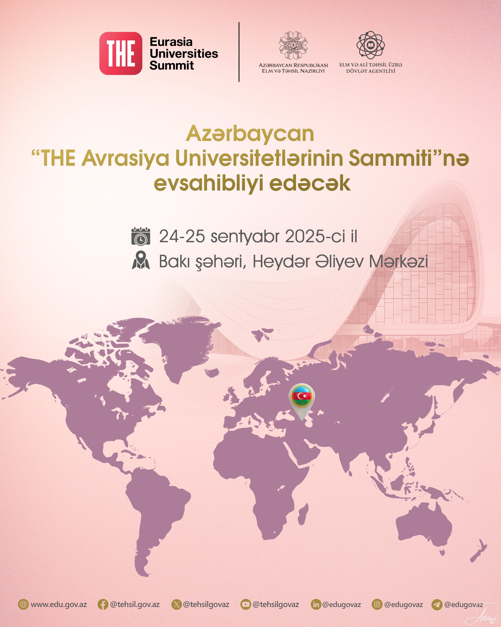 24-25 sentyabr 2025-ci il tarixlərində Bakı dünyanın aparıcı universitet rəhbərləri, alimləri və təhsil ekspertlərini bir araya gətirəcək. "Times Higher Education" (THE) beynəlxalq reytinq agentliyi tərəfindən təşkil olunan "THE Eurasia Universities Summit 2025" bu il “Transmilli tədqiqat: bilikdən qlobal təsirə doğru” mövzusuna həsr olunub.