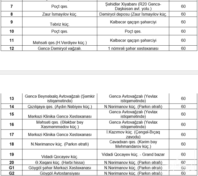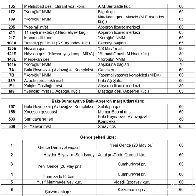 Bu mərhələdə tarifi artan marşrutların siyahısı:![]()