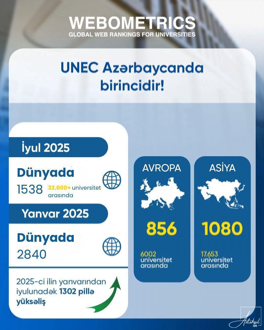 AzTehsil.com xəbər verir ki, yanvar ayı ilə müqayisədə 1302 pillə irəliləyən UNEC, dünyanın 200-dən çox ölkəsindən olan 32.000-dən çox ali təhsil müəssisəsi arasında 1538-ci yerə yüksəlib.