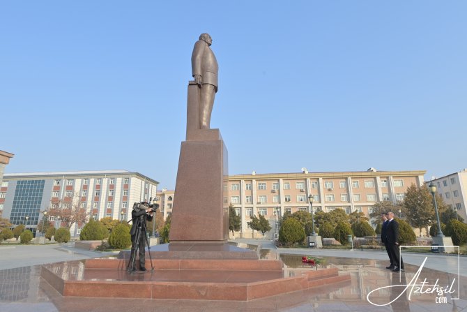 Qəbuldan əvvəl ulu öndər Heydər Əliyevin abidəsi ziyarət edildi, önünə gül dəstələri düzülüb.