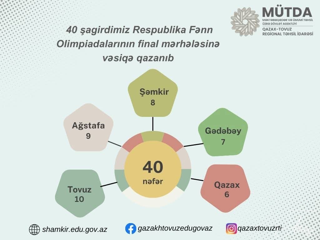 AzTehsil.com xəbər verir ki, Qazax-Tovuz Regional Təhsil Təhlükəsizliyi ilə bağlı ümumi təhsil müəssisələrinin 40 şagirdi Respublika Fənn Olimpiadalarının final mərhələsinə vəsiqə qazanıb.